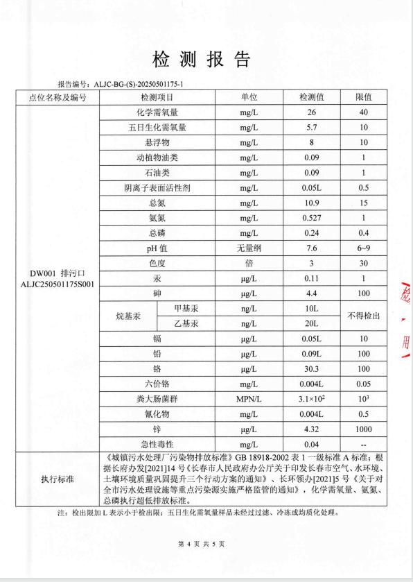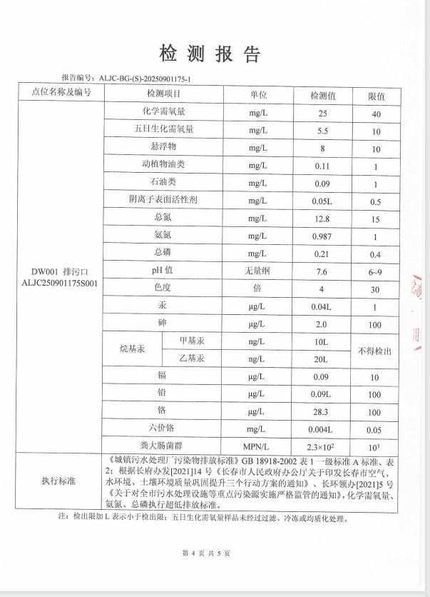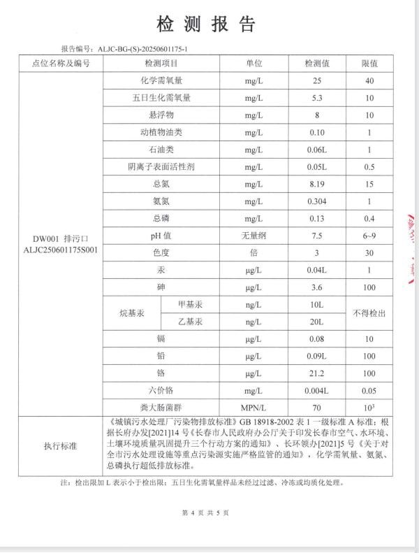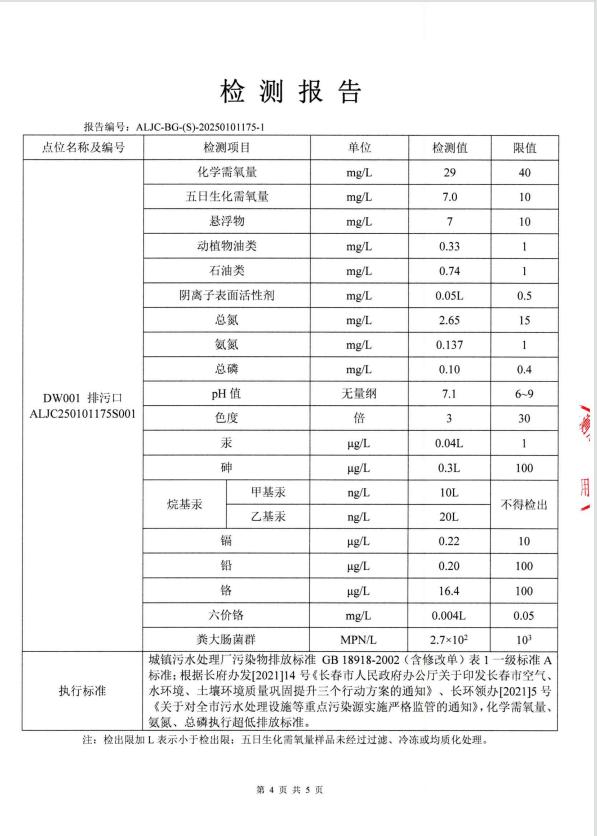 3、主要排放污染物为:COD、NH3-N、TN、TP,设有一个总排放口,污水处理达标后排放至第二松花江。