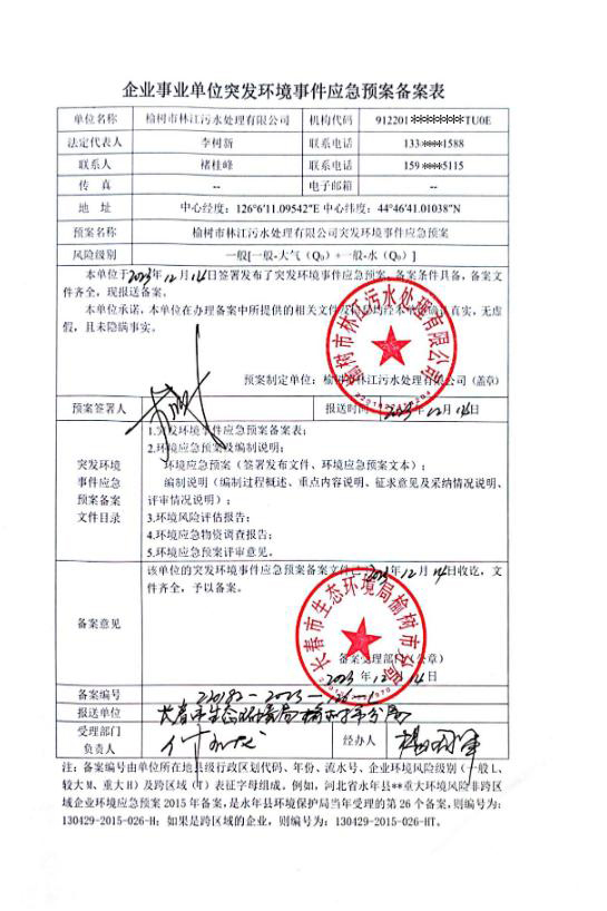 单位地址:吉林省长春市榆树市五棵树镇临江村莫里库屯西南侧(榆树市林江污水处理有限公司办公楼二层)