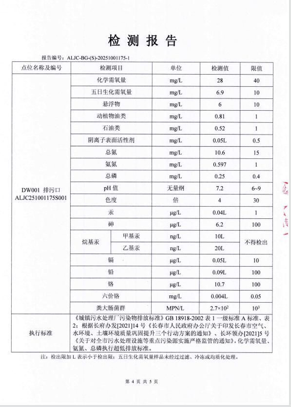 2、2025年1月1日至2025年12月31日,累计处理污水821.8076万吨,其中COD平均出水为27.3mg/L;氨氮平均出水为0.27mg/L;总磷平均出水为0.14mg/L;总氮平均出水为7.68mg/L,各项出水指标稳定,完全达到国家规定的一级A排放标准。
